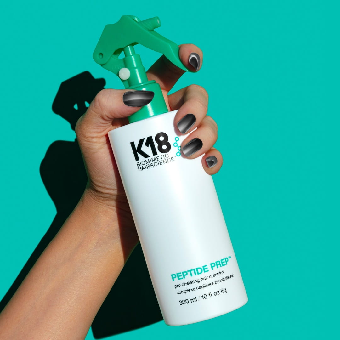 Udowodniono klinicznie, że ta innowacyjna kuracja demineralizująca w sprayu redukuje 7 rodzajów osadów z metali i minerałów (wapń, magnez, miedź, cynk, nikiel, kadm, ołów) zapewniając bardziej żywy, równomierny kolor, przywraca sprężystość i połysk oraz poprawia skuteczność produktów. Usunięcie osadów tworzy wyraźną ścieżkę dla formuł naprawczych K18PEPTIDE.