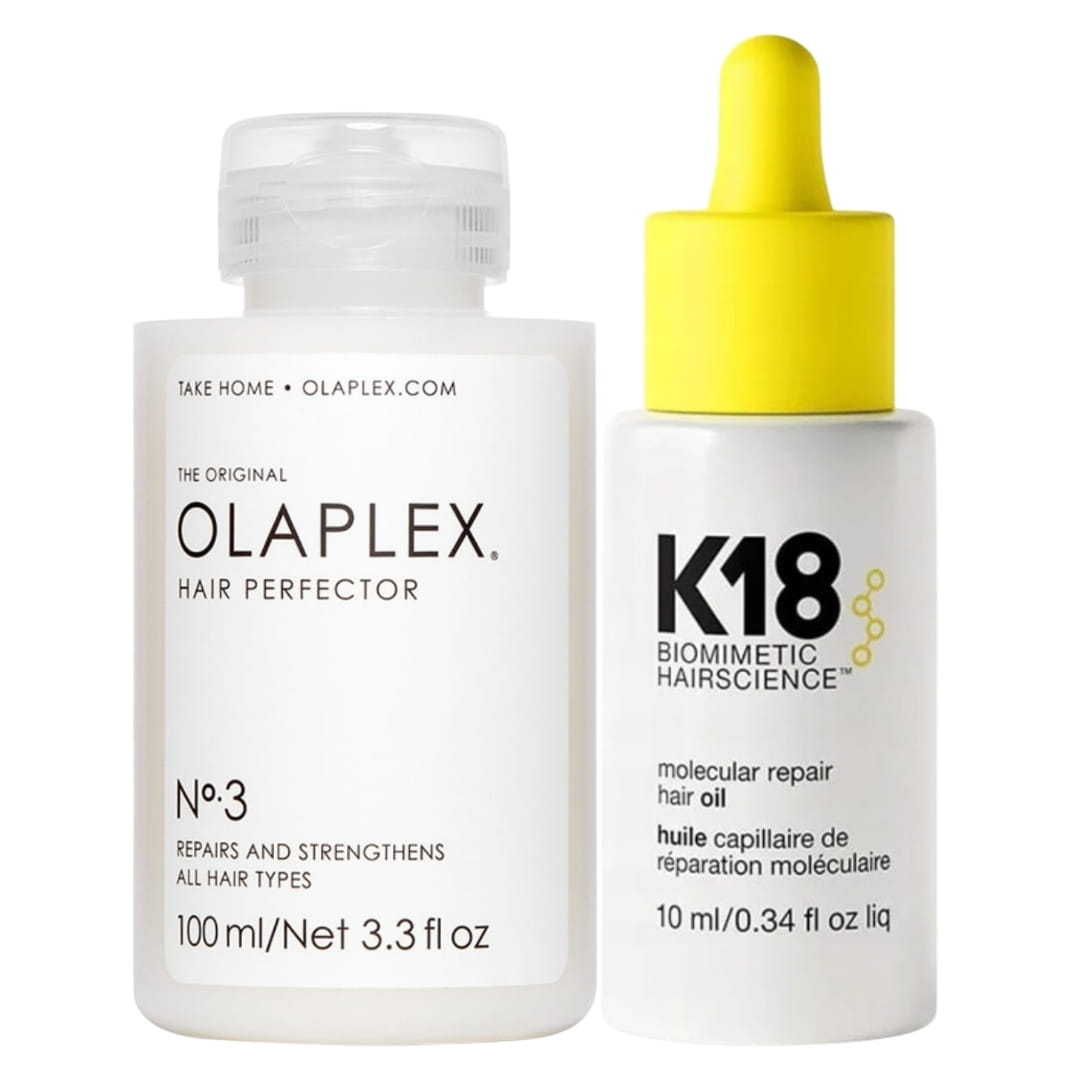 Połączenie dwóch przełomowych produktów w regeneracji włosów. Kultowy Olaplex No.3 Hair Perfector odbudowuje mostki dwusiarczkowe, a K18 Molecular Repair Hair Oil wzmacnia i wygładza włosy, nadając im miękkość i blask.