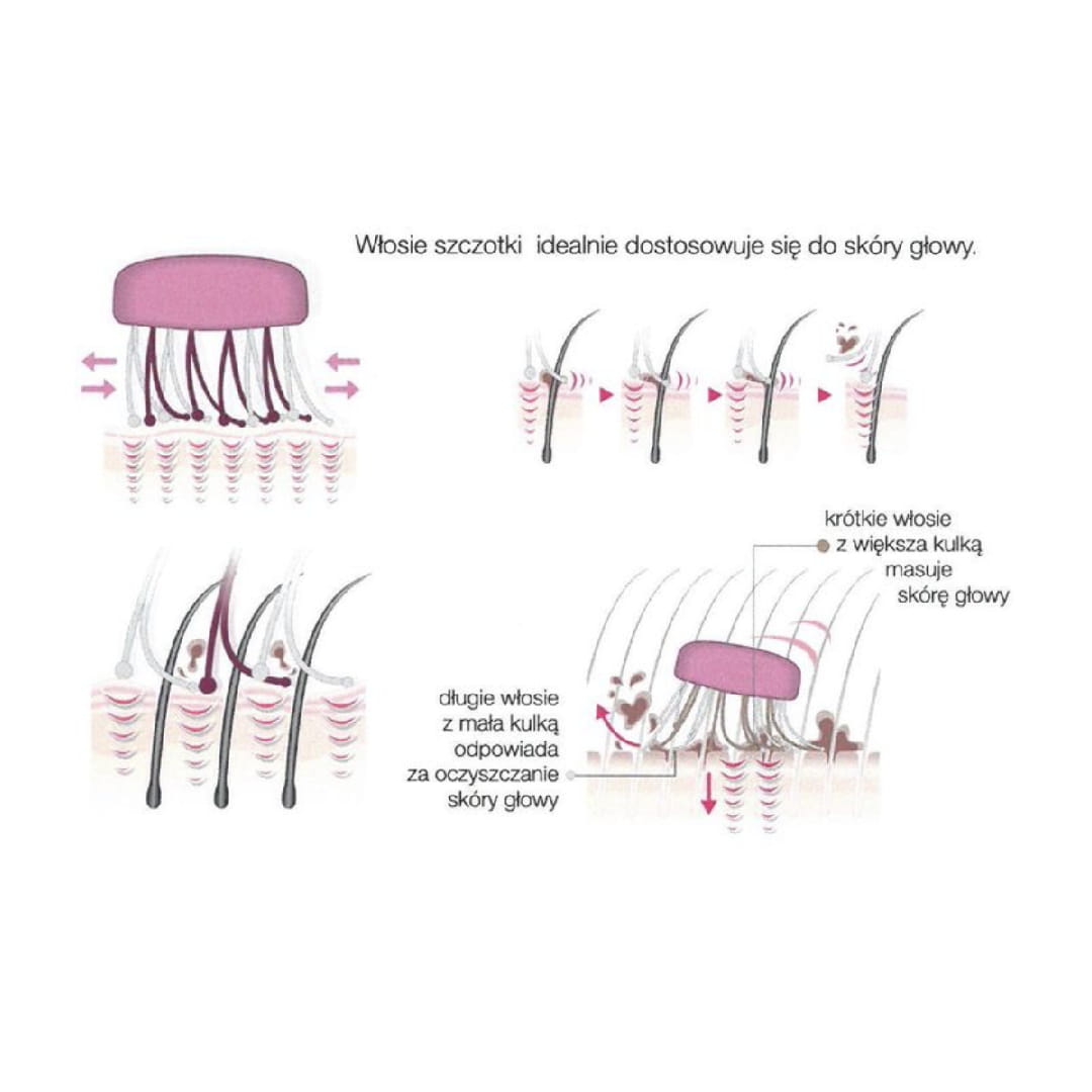 - Przyłóż szczotkę do głowy w taki sposób, żeby jej włosie przylegało do skóry głowy.